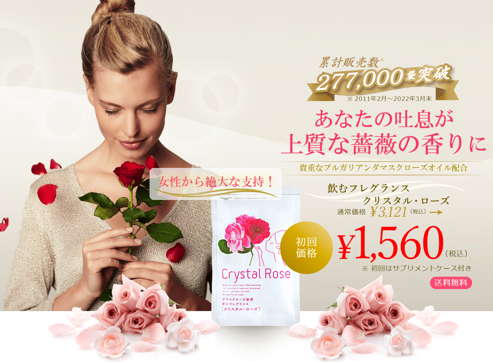 「口臭ケアしながら、体の内側から美しくなりたい」「自然な香りで上品な印象を与えたい」「人と話す時に自信を持ちたい」そんなあなたに、飲むフレグランス【クリスタルローズ】は最適な選択です。クレオパトラが愛した香りで、あなたも内側から輝く女性へ。まずは初回限定価格でお試しください。